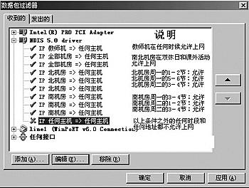 4.设置封包过滤器规则(只设置允许上网的情况)(1)依次点击“设置→高级→数据包过滤器”。(2)在“收到的”标签下,选中与局域网相连的网卡,单击[添加]按钮。(3)添加教师机规则(图8)。