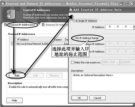 果冻提示 当然,局域网内的访问不一定都是善意的,我们可以设置允许访问的IP地址的范围,最大限度地保证互访的安全性。 如果你希望能够由自己定义允许访问的IP地址范围,可以在McAfee防火墙主窗口依次点击“Utilities→Trusted&Banned IPs→Trusted IP Addresses”,点击“Add”按钮。在弹出的可信任IP规则窗口中,点击“An IP Address Range”,在下面输入IP地址的范围(图4),最后点击“OK”按钮退出设置对话框即可。