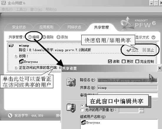 局域网共享目录的访问监控功能,它允许用户随时查看本机共享目录的访问情况。通过这一功能,用户可以随时取消不必要 的共享目录并中止其他用户对自己的共享目录的访问,尽可能地阻止恶意程序的入侵以及他人的“偷窥”。
