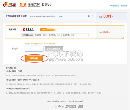 5、点击确认后,跳转至e签宝-连连支付平台,输入校验码后,点击【确认支付】,成功完成支付后则实名认证成功;