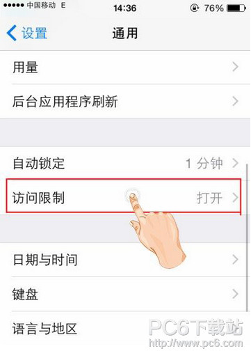 1.在“设置”应用中,“通用”选项页面,点击进入“访问限制”。