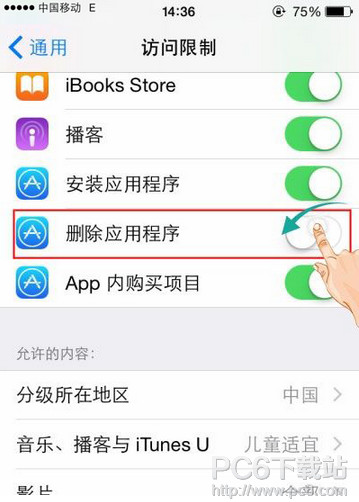 3.在访问限制页面,把关闭“删除应用程序”功能,这样子就再也不怕孩子删除你辛苦安装的App了。