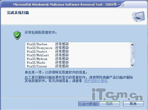 选择接受并点击下一步后,工具会对系统进行简短的扫描(这是可以理解的,因为工具只是检查几种病毒,只需查找病毒所影响的几个区域就可以了),接着会弹出扫描完成窗口(如图2所示),点击窗口中的某一个病毒名,就可以获得恶意软件的相关信息。最后点击完成就可以了,这时如果你系统中有病毒就会被清除掉了。