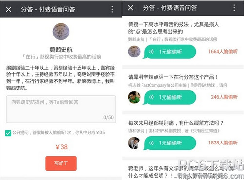 分答是一个付费语音问答平台。每个人都可设定自己接受提问的价格,任何人只要付费就可向其提问,被问者可用60秒内的语音作答。这条语音,可以被其他人付费偷听,偷听收入问者、答者平分。所以回答能赚钱,提问也可能赚钱。