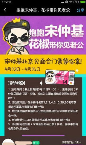 2、截止5月14日9:00,主播收到礼物,粉丝为主播在微信分享页点赞都可以获得积分;活动结束后,在总榜排名第1,2,3,4,5,10,20,30名可以获得宋仲基见面会门票一张,为获奖主播共享最多积分的粉丝也可以获得门票一张哦;点赞棒1,2,3可以获得门票一张。