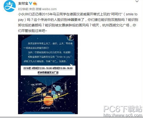 当时外媒表示,技术还不成熟,实现起来还是很有难度。不过今天,支付宝表示,这个传说中的人脸识别神器要来了,明天将在杭州西湖文化广场亮相。