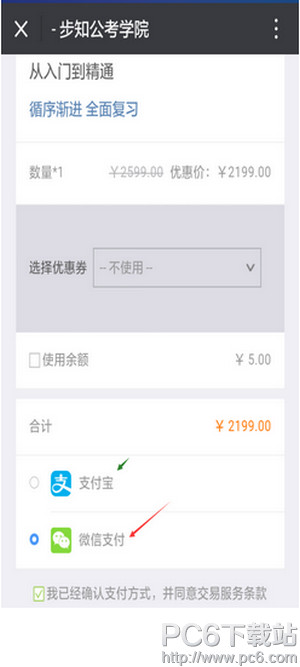 在手机浏览器上搜索”步知公考学院“,进入后选择适合的方案,在支付方式中选择”支付宝“,即可在手机上通过支付宝完成支付。