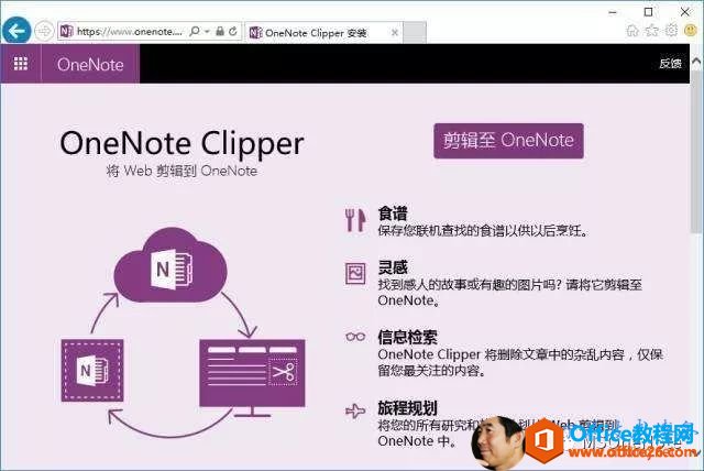 OneNote Web Clipper就是网页内容捕获器,它可以快速将任何网页捕获到 OneNote,以便轻松编辑、批注或共享。同时,它还可以减少杂乱内容,并且只剪辑真正需要的文章、食谱或产品信息。