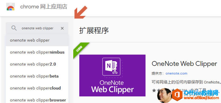 4、在Chrome网上应用商店里搜索OneNote Web Clipper,安装即可。