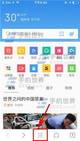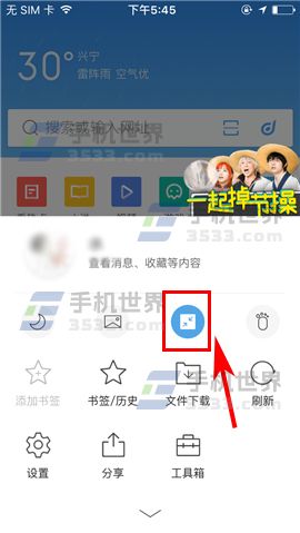 打开QQ浏览器APP,首先点击首页下方中央处的三横线菜单图标,然后点击蓝色的“全屏模式”按钮即可关闭。(如下图)