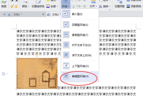 选中图片,点击“环绕”菜单下的“穿越型环绕”,如图所示