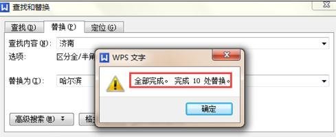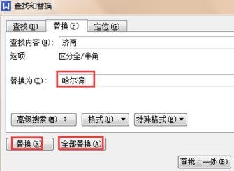 比如我们在替换输入框内输入哈尔滨,可以将文章内的济南替换为哈尔滨,如下图所示。
