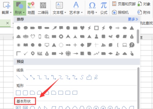 4、点击形状选项在其子级菜单那里找到基本形状选,如图所示:
