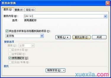 我们可以利用它迅速而准确地输入希腊字母。在“查找内容”选项右侧的文本框中输入“[Α-ω]”后,勾选“突出显示所有在该范围找到的项目”和“搜索选项”标签下的“使用通配符”选项(如图5)后,