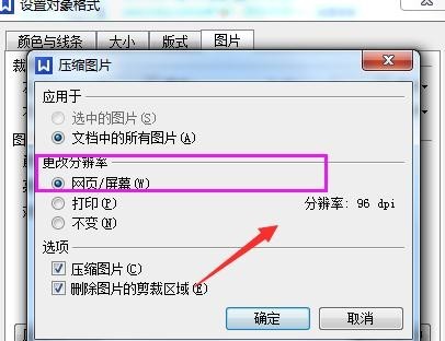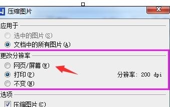 设置压缩图片分辨率,有三个选项 。网页/屏幕类型是最低的分辨率, 默认是打印200dipi