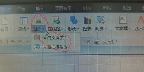 2、展开后,“插入”项下方出现新的一行工具栏,点击正下方“图片”项,出现“来自文件(P)”、“来自扫描仪(S)”两项;