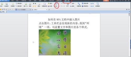 5、鼠标点击图片,最上方第一行工具栏最右侧会增加一项“图片工具”一项,点击“图片工具”,下呈现新的工具栏,点击“环绕”功能;