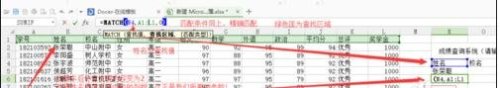 姓名通过这个函数,能查找出来了,那么后面的校别,性别,年级,各科成绩怎么显示出来呢?照葫芦画瓢一个一个输入函数吗?肯定不是了,那样太麻烦了,如果后面有几千个呢,那不累死了!接下来看我操作: