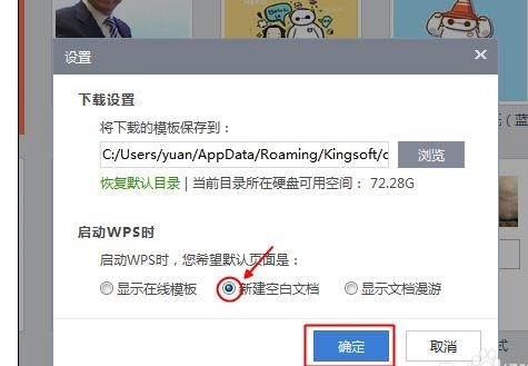 在弹出的窗口中选择“启动WPS时”中的新建空白文档前选中,点击确定