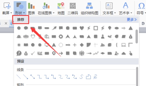 4、点击形状选项,在其子级菜单那里找到推荐选项,如图所示: