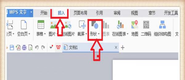 1、打开WPS软件,新建空白文档,找到插入,单击一下,再找到“形状”,单击一下。