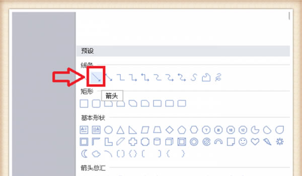 2、单击“形状”后,就会出现很多自带的形状图形,找到“线条”,找到线条中的箭头图样,单击一下。