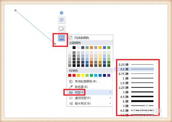 4、此时箭头是选中状态,在箭头的右侧有四个设置功能,一般需要是最后一项“形状轮廓”,单击一下形状轮廓,就会出现对箭头的设置功能了。比如箭头的线型,单击箭头线型,出现各种式样的箭头,设置的主要是线的粗细情况,单击就可以了。