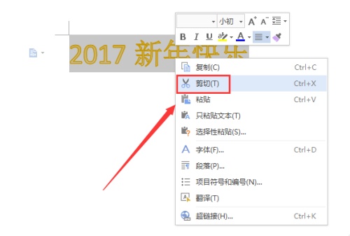 5、选择刚刚输入的文字,点击鼠标右键,在弹出的右键菜单里找到剪切选项,如图所示: