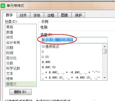5、在类型中输入:[黑色]男;;[红色]女