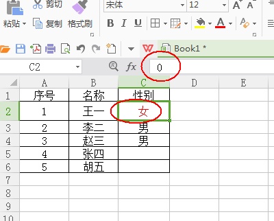 7、在刚刚设置的单元格中输入0 则显示为女,输入》0的数字则显示为男。