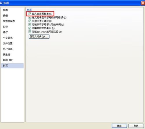 2、弹出选项对话框,选择拼写,选中输入输入时拼写检查复选框即可,如图所示。