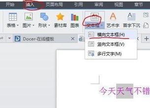 然后我们选中“天气‘,点击插入-文本框-横向文本框,如图