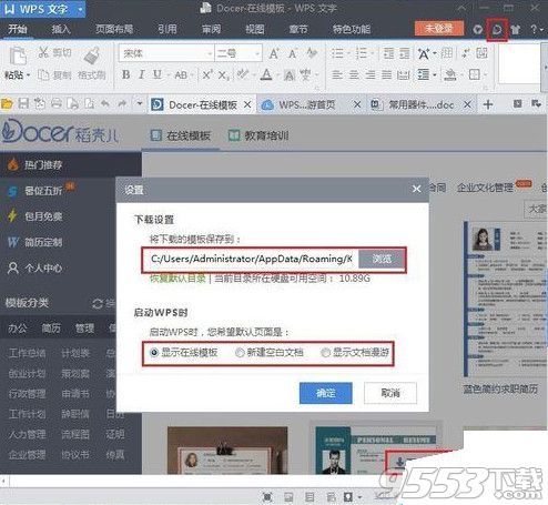 3、如果想再次显示在线模板,打开WPS文档,按右上角红色方框中的的“D”型,弹出在线模板,之后“设置”,在启动WPS画面(选择“显示在线模板“),其配置如下图,按”确定“后,关闭文档,再次打开,则又会显示在线模板了