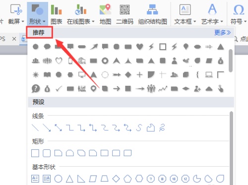 4、点击形状选项,在其子级菜单那里找到推荐选项,如图所示: