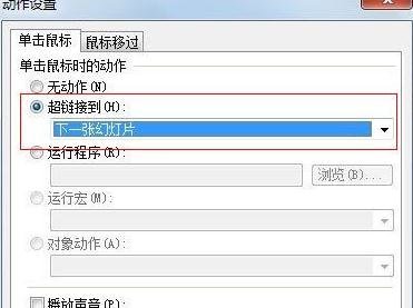 鼠标右击矩形,选择动作设置,勾选超链接到,选择下一张幻灯片。