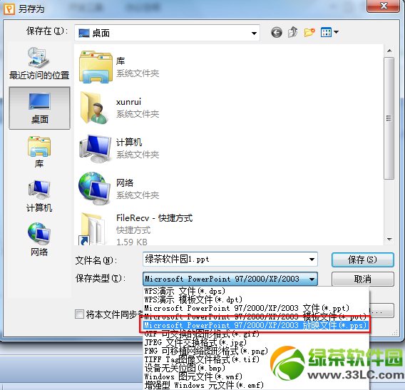 在弹出的对话框的“保存类型”栏,选择“放映文件(*.PPS)”。确定后,在指定保存的文件夹中出现一个不同格式的白色文件。
