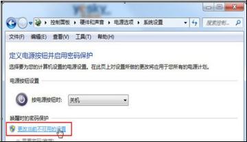 2、然后系统进入控制面板-硬件与声音-电源选项-系统设置面板中,点击“更改当前不可用的设置”。