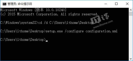 说明:本文中setup.exe文件放在桌面,第一条命令用来将CMD当前路径更改为桌面。你也可以只使用第二条命令,但命令中setup.exe和configuration.xml需替换为文件的完整路径。
