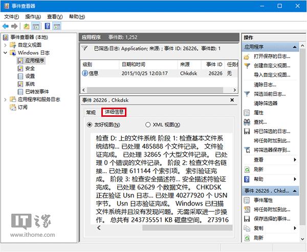 在Win8.1/Win10中,磁盘检查详细信息并不像Win7及以前系统那样在过程中直接给出,这使得某些专业用户很难直接了解检查结果。微软这样安排可能和更新日志详细内容不面向普通用户开放一样,为大多数用户“减轻负担”。不过,如果你的确需要查看这些日志,可以到“事件查看器”中进行搜寻,而且并不麻烦。