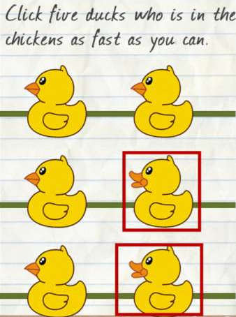 1.只要连续点出混在鸡群中的鸭子,鸭子的嘴巴不一样,只要鸡群开始出现到结束,点击完鸡群里面的鸭子即可通关。切记是点5只,不要点多了。