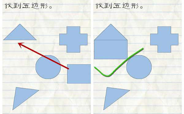1.找到五边形,把右边的长方形拖动到三角形下面,就形成了一个五边形,点击这个五边形即可通关。