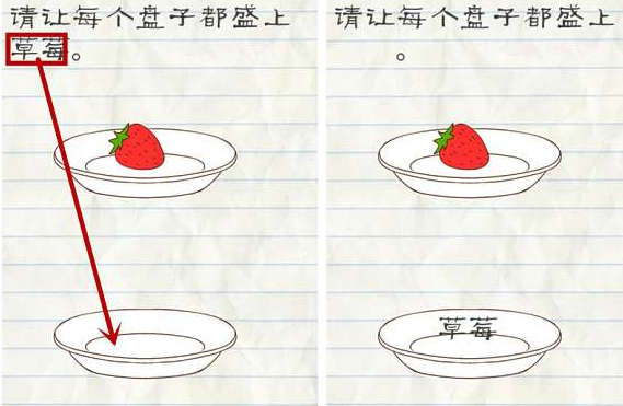 1.让每个盘子都盛上草莓,只要把问题上的草莓拖动到下面的空盘子上,即可通关。
