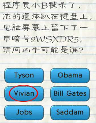 最囧游戏2第28关攻略:程序员小B被杀了,他的遗体趴在键盘上,电脑屏幕上留下一串暗号2WSXDR5,请问凶手是谁?