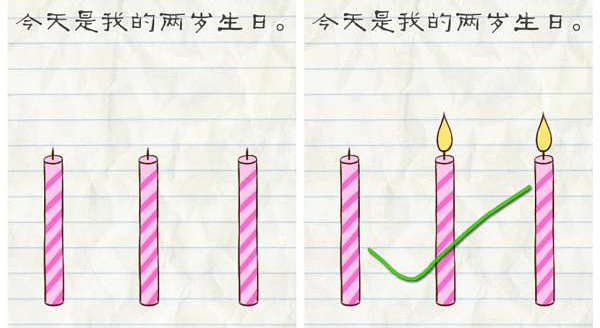 1.今天是我的两岁生日,只要伸出你的两根手指按在两支蜡烛上,两支蜡烛有火苗了即可通关。