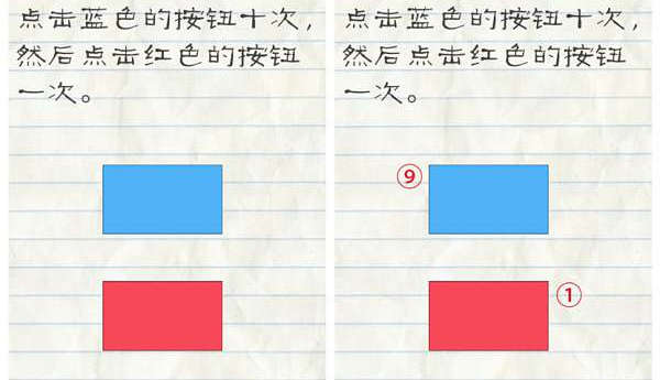 1.点击蓝色的按钮十次,然后点击红色的按钮一次。不要以为屏幕上出现的数字就是点击的次数,自己数好自己点击的次数即可,蓝色十次红色一次。