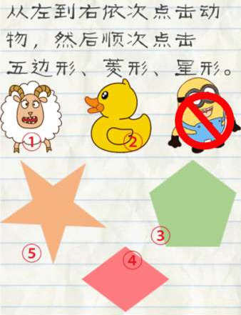1.从左到右依次点击动物,然后顺次点击五边形、菱形、星形。小黄人不是动物,所以不要点击,按照下图顺序点击即可通关。