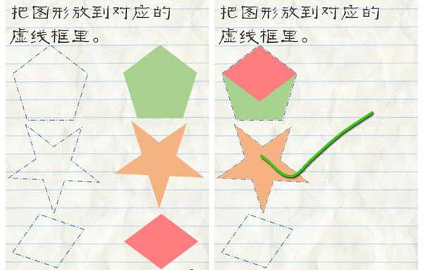 1.把图形放到对应的虚线框里。按照下图把图形摆好既可通关。