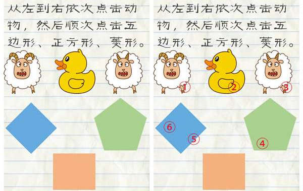 1.从左到右依次点击动物,然后顺次点击五边形、正方形、菱形。按照下图数字顺序点击,即可通关。