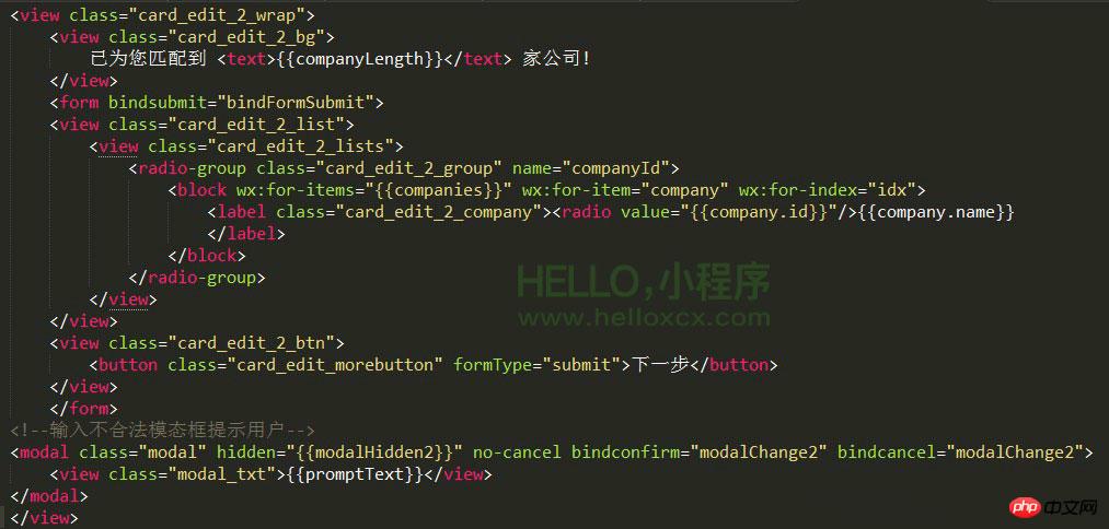 这时候跳转到编辑页 2 页面,这个页面是根据用户填写的手机号码识别到匹配的公司,页面非常简单,一个数据循环而已,单选框日后可能还需要美化一下。
