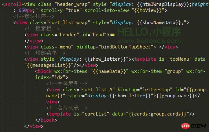 在这里如顶部有些菜单栏的话,你就要注意好布局了,不然会出现向下偏移这个菜单栏的高度,其实你只要和字母索引同级下即可避免此问题(这里的顶部菜单以模板分离出去了,分离模板的时候需注意下,需要在这里绑定模板的一些数据会出现失效,具体没有继续深入研究下去)。